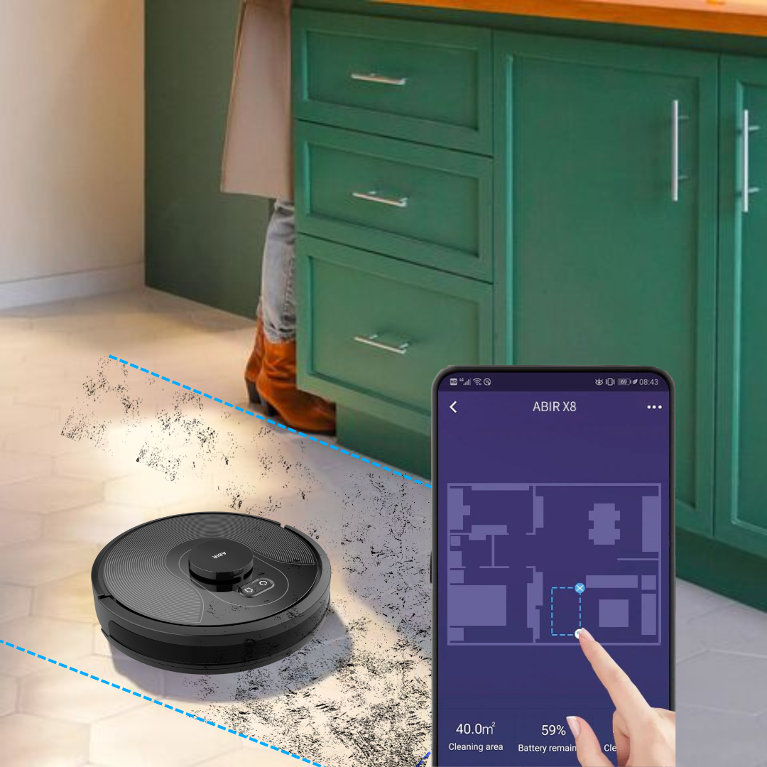 With ABIR-X8 you can create a personalized map of the house and send commands to the robot at any time from any distance to clean specific parts of the house such as only the bedroom, kitchen, hallway, or kitchen and bedroom. You can also follow the cleaning of the house in real-time from the application on your phone.